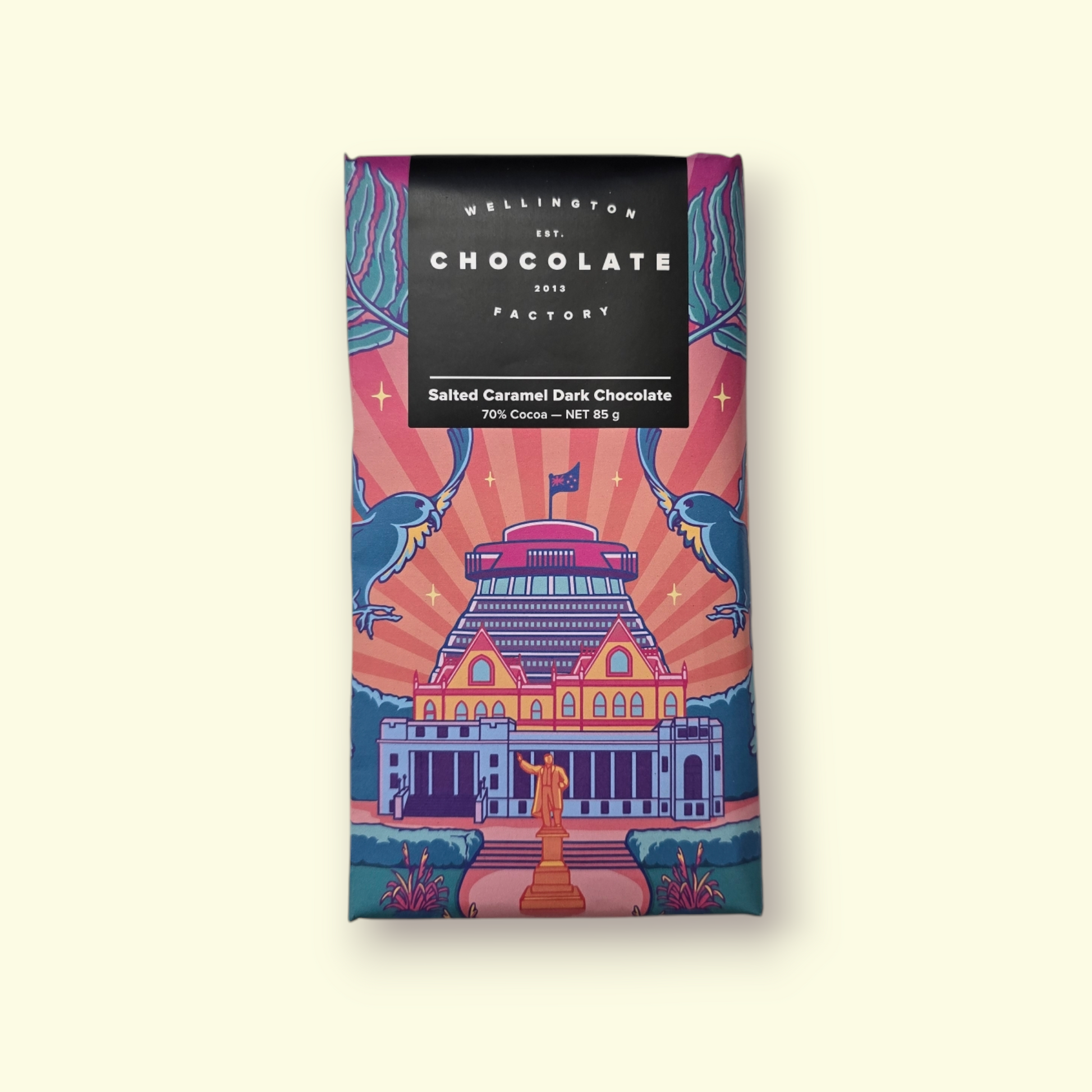 We've partnered with local Wellington icons Wellington Chocolate Factory, to bring you their ever-popular Salted Caramel Dark Chocolate bar in a custom New Zealand Parliament wrapper, designed by Nina Smith at Inject Design. Celebrate our iconic architecture and grounds while enjoying a delicious treat, these bars are the perfect gift to a loved one or yourself.