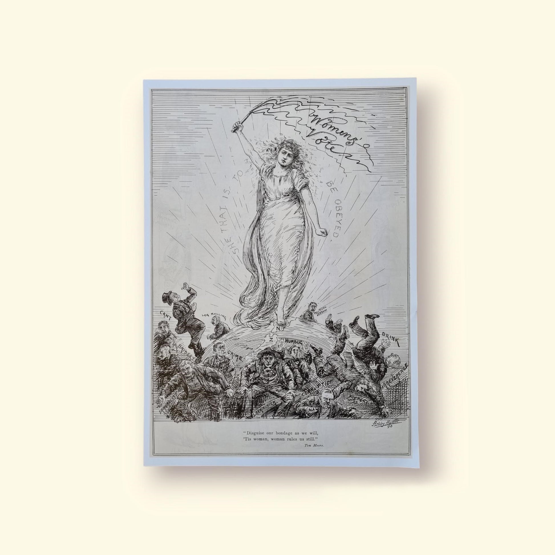 A2 poster/print featuring a political cartoon celebrating women's suffrage from the late 19th century. New Zealand was the first country to grant women the right to vote, in 1893.